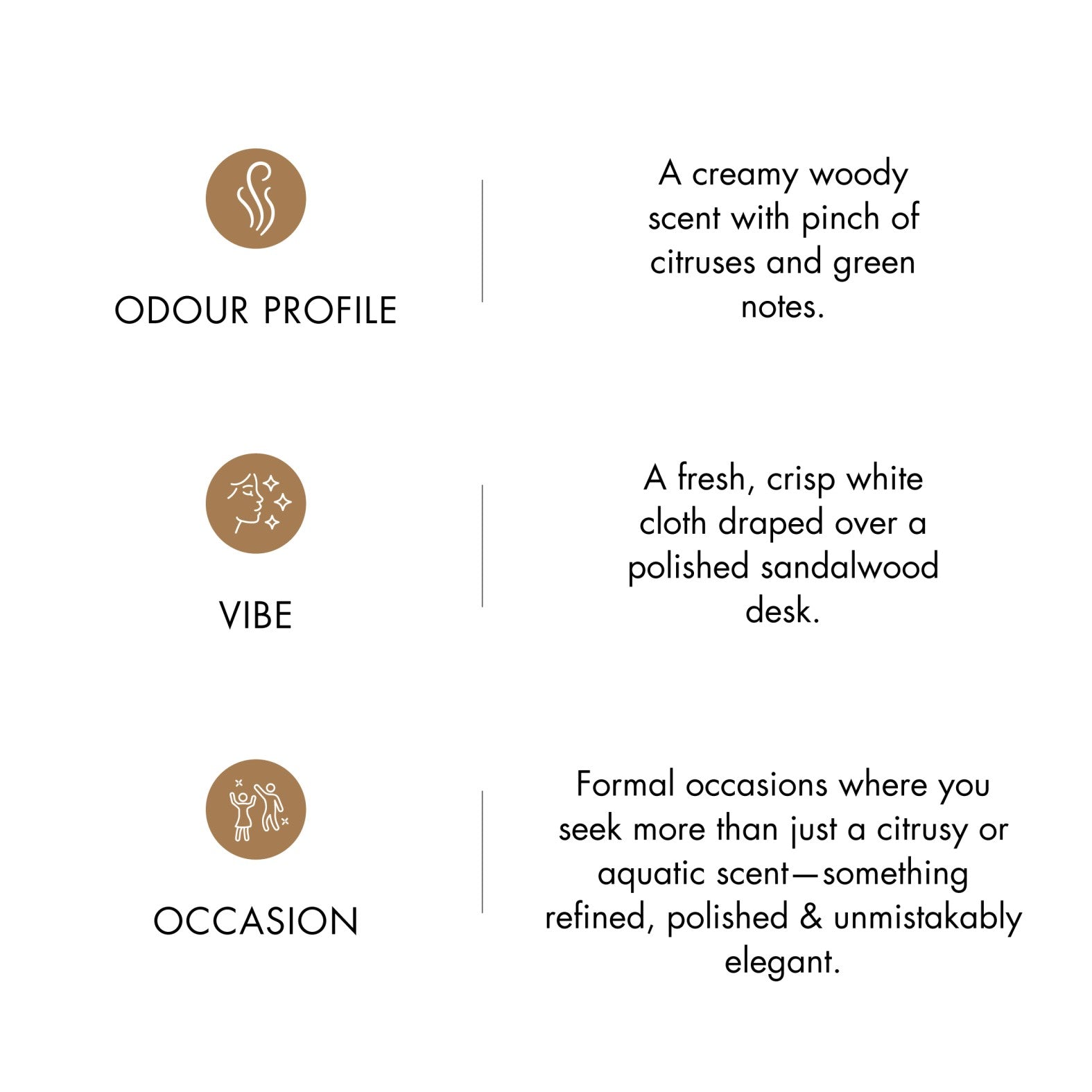 The initial impression is one of immaculate purity, as a clean & powdery burst of iris intertwines with vibrant green spices and invigorating citruses. Soon, the grand entrance of rich sandalwood takes center stage, accompanied by the elegance of cedarwood, the allure of jasmine, and the playful zest of orange, collectively unveiling a smooth, woody & fresh fine fragrance.