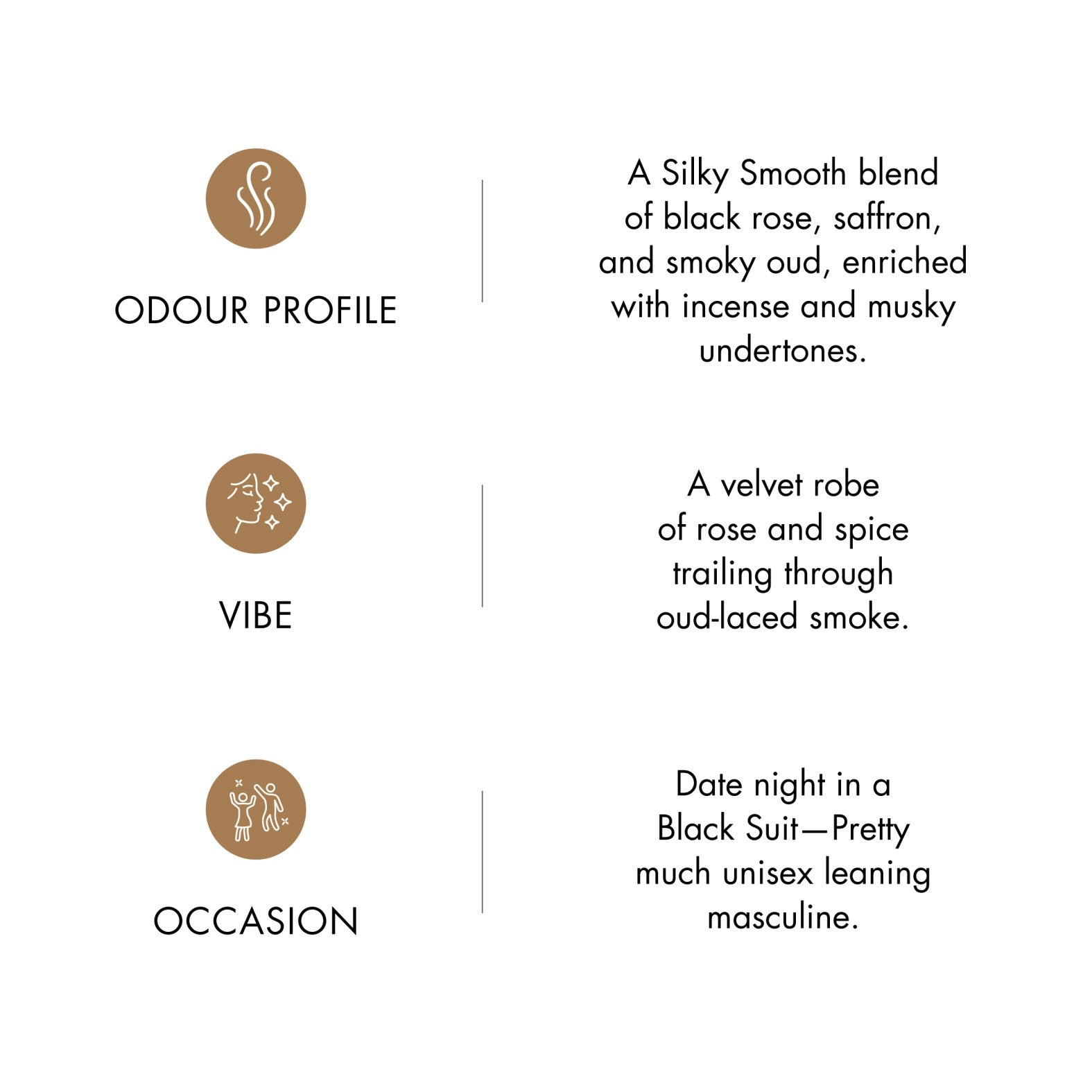 Luxurious fragrance; black rose with smooth oud and vanilla is a combination to die for