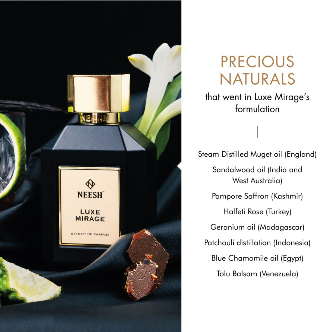 For Luxe Mirage, Chris blended black rose with tobacco & leather for an authoritative & masculine scent profile